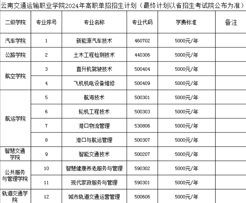 拟面向云南省单独考试招生高职(专科)12个专业400人,分专业招生计划由云南省招生考试院统一向社会公布,具体招生计划以云南省招生考试院公布为准。